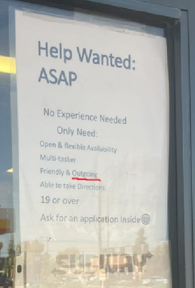 This situation probably isn’t always a bad thing. Certainly there are careers where Introverts will, on average, outperform Extroverts, and vice versa. There are also many jobs where temperament directly affects your ability to perform the job; I’d hesitate before putting a fellow Introvert on a sales team, for instance. But Subway isn’t a sales team. There has never in history been a situation where someone’s experience at Subway was bad because the person making their B.L.T. didn’t also make enough small talk with them. There’s also no reason why a pleasant, friendly person, which is what Subway really wants, can’t be also be someone of few words.