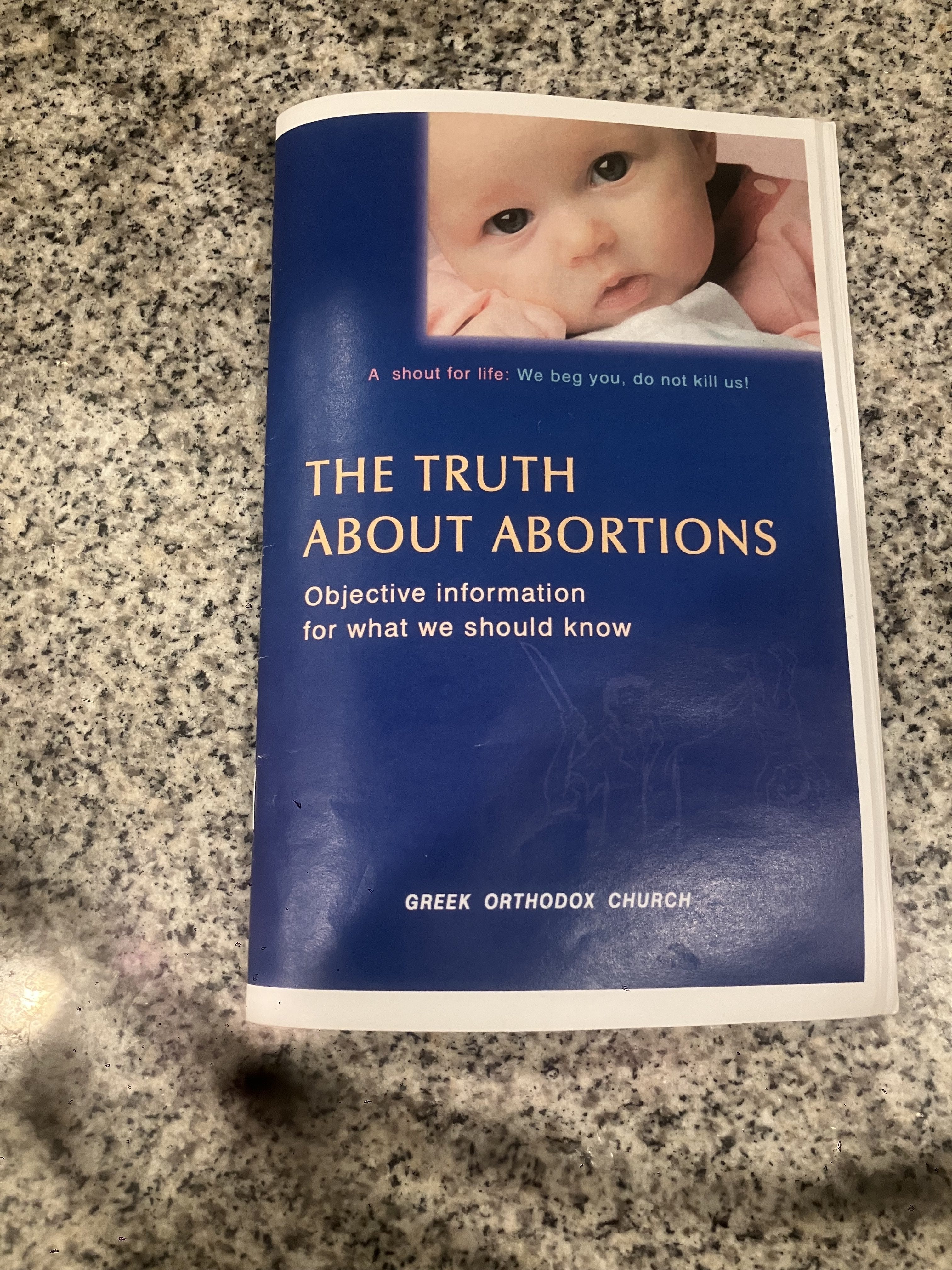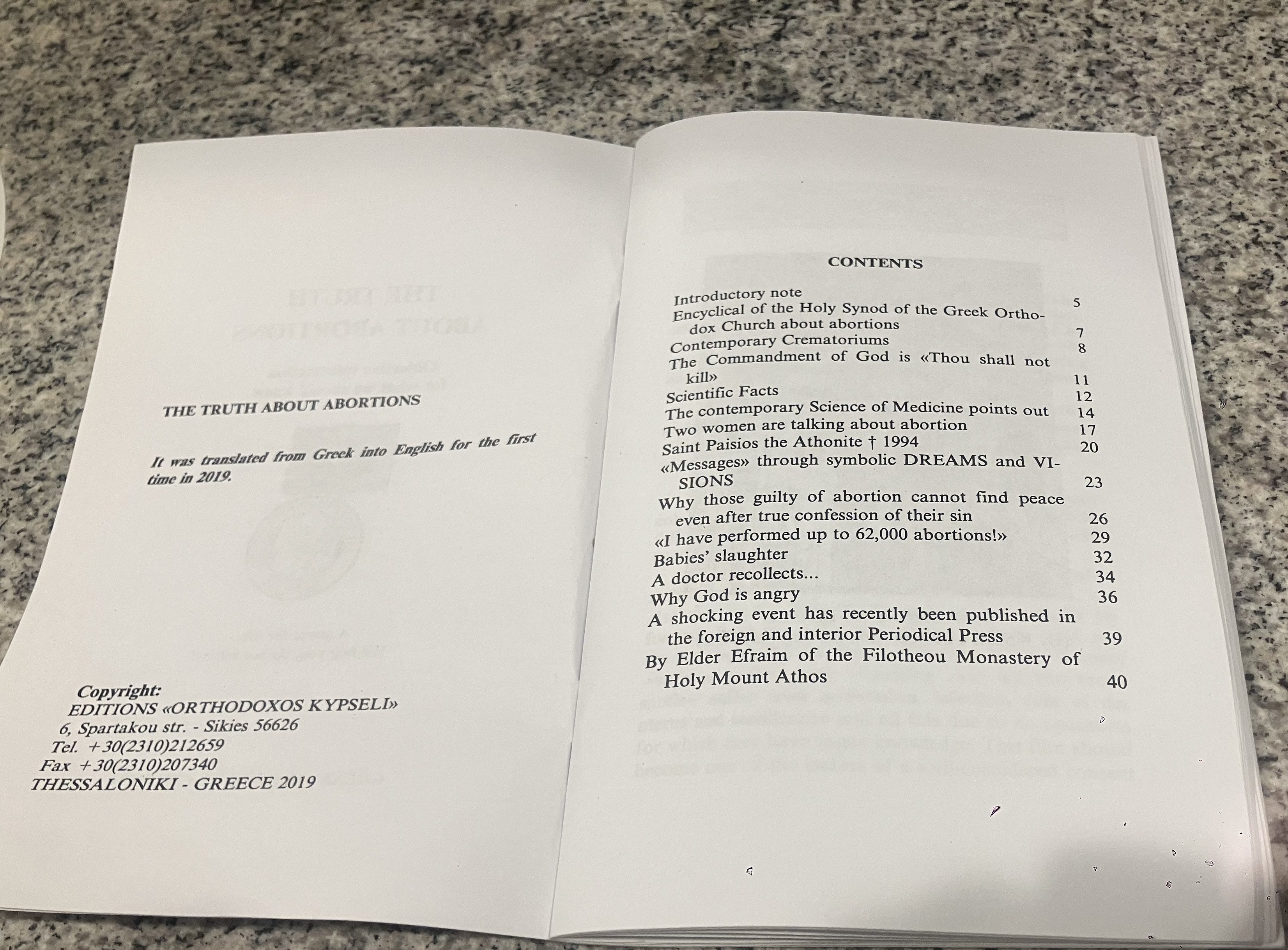 Once while visiting a monastery, I went to their bookstore and purchased a tract titled: The Truth About Abortions: Objective Information For What We Should Know. It was originally published in Greece in 2019 by Orthodoxos Kypseli, a publisher in Thessaloniki, but I cannot find the booklet for sale on their website, so I’m uploading pictures of it to confirm it is indeed real.